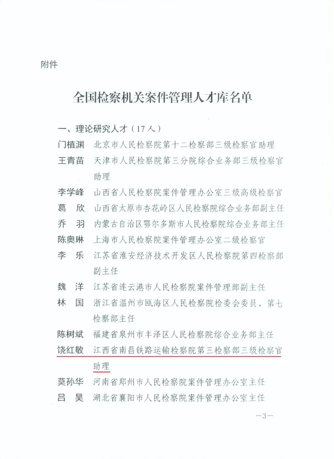 近日,最高人民检察院政治部、案件管理办公室联合发布《关于确定全国检察机关案件管理人才库成员的通知》,经过层层筛选和严格评审,南昌铁路运输检察院第三检察部饶红敏入选全国检察机关案件管理理论研究人才,为做实案件管理、做优理论调研工作发挥了示范、引领作用。