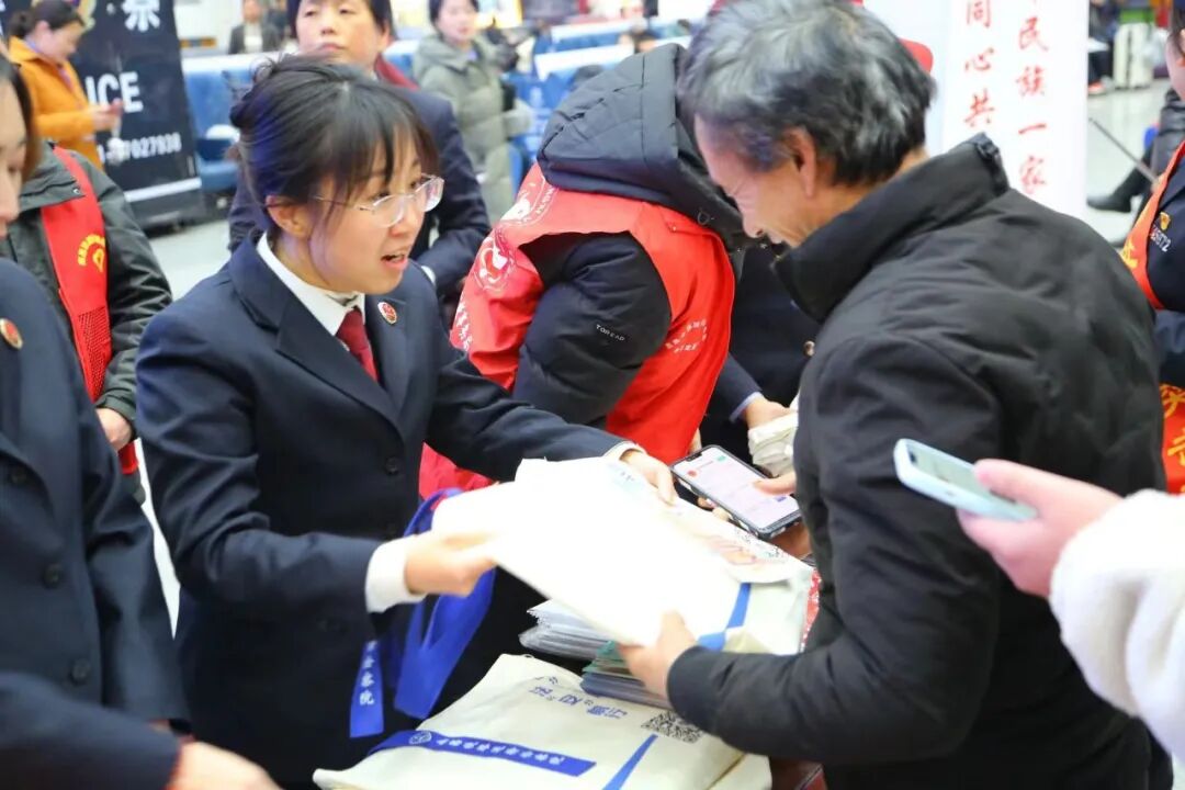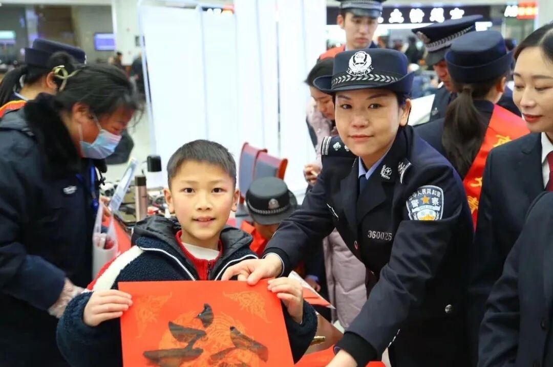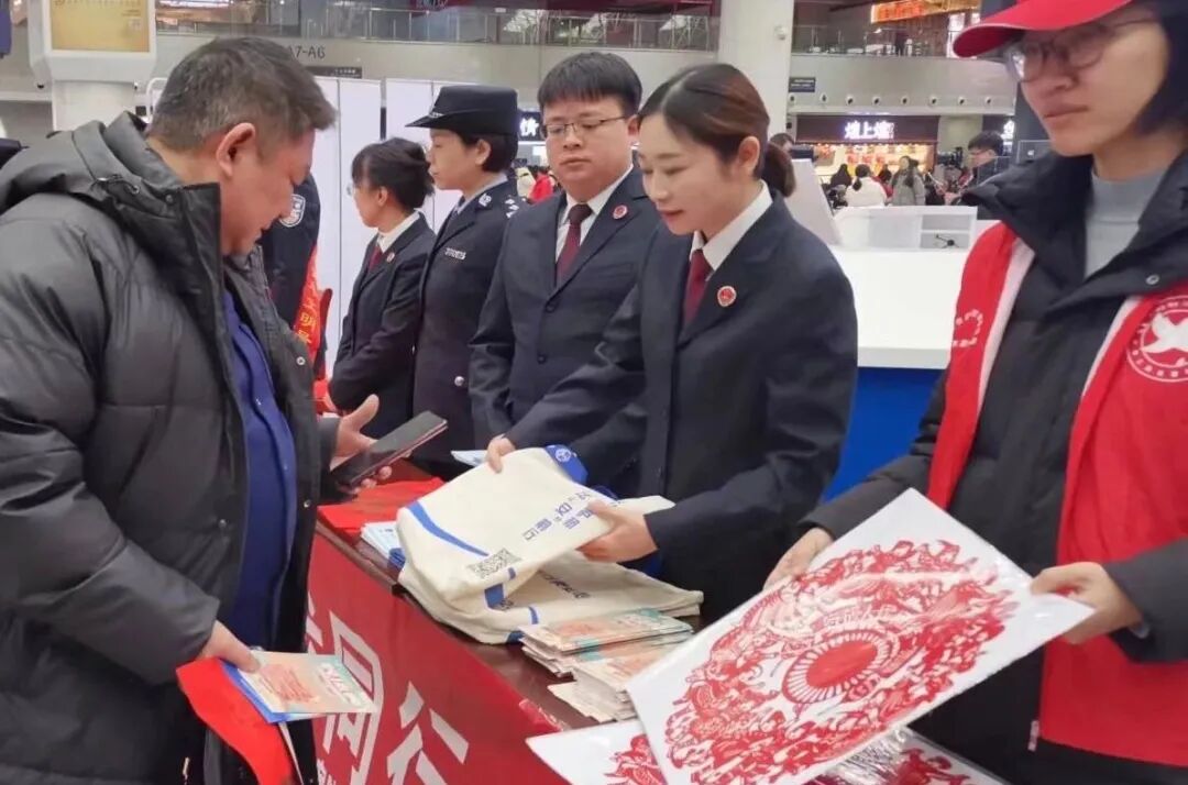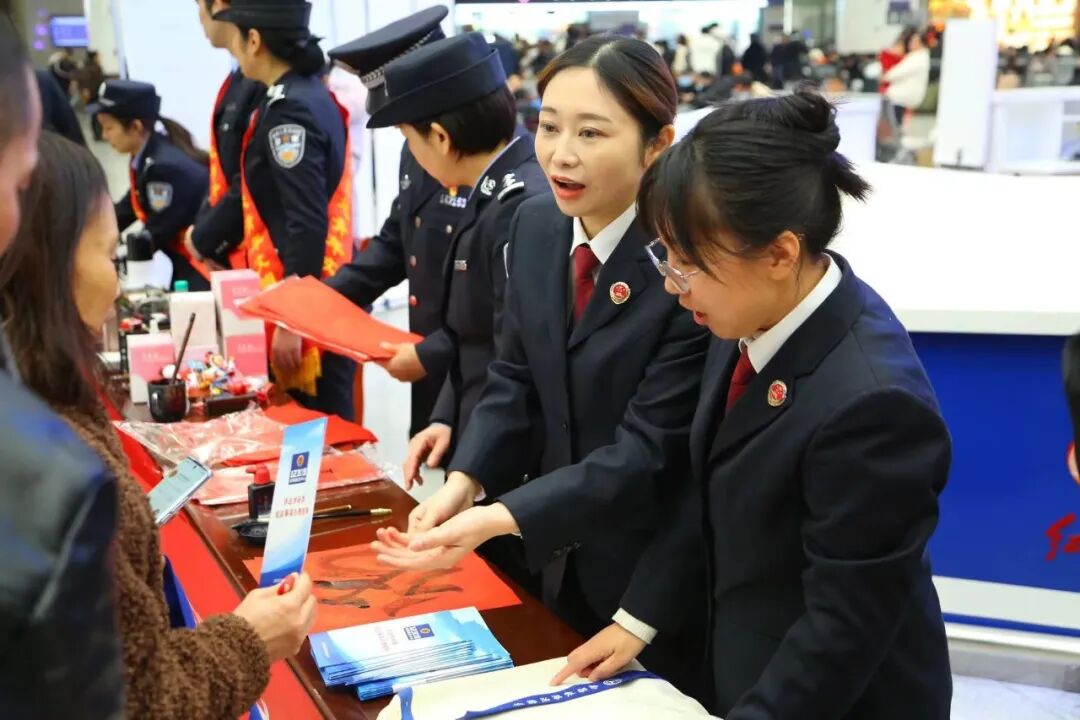 在南昌站候车室,该院检察官与南铁公安民警、南昌市民宗局干部一同将“电诈”防范、宪法讲解、铁路安全常识等方面“干货”,通过摆放宣传展板、发放宣传册、“面对面宣讲”的方式,向旅客开展宣传,答疑解惑;现场设置了“平安春运”有奖问答活动,通过写春联、送“福”字、赠窗花等形式,极大提高了旅客参与的热情。旅客张大爷表示参加“平安春运”有奖问答是一种新颖而富有意义的体验,不仅能得到精美的礼品,更加深了自己对铁路乘车安全知识、电信网络诈骗常识的了解。